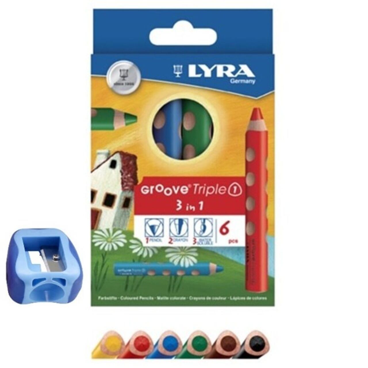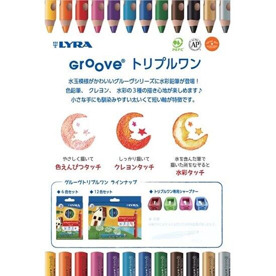 おもちゃ箱 リラ グルーヴトリプルワン 6色セット&シャープナー1個付き.色鉛筆、クレヨン、水彩の3種の描き心地が楽しめる水彩色鉛筆 水玉模様が可愛いグルーヴシリーズ